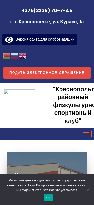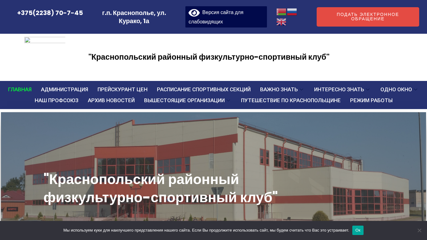 | SEO-описание | «Краснопольский районный физкультурно-спортивный клуб» В 120 километрах от областного центра Могилёва находится посёлок городского типа Краснополье. В 2013 году здесь было начато строительство физкультурно-оздоровительного комплекса, а в 2017 году он был сдан в эксплуатацию и передан в оперативное ведение учреждению «Краснопольский районный физкультурно-спортивный клуб». Комплекс представляет собой двухэтажное здание общей площадью 6000 квадратных метров. |