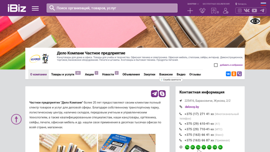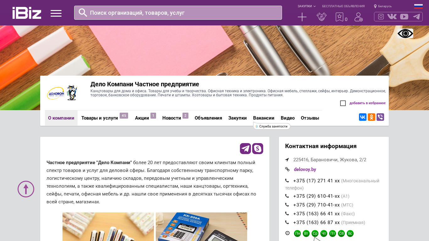 | AI-анализ | This website is a business enterprise called "Delo Company" offering office supplies and goods for both home and office use. The product range includes items for education and creativity, office equipment and electronics, office furniture, storage solutions, safes, interior design, demonstration, trading, and banking equipment, printing and stamping supplies, household items, and food products. The company is located in Baranovichi, Belarus, and can be reached at the provided address and contact numbers. |