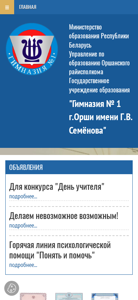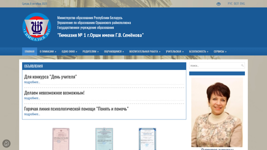| AI-анализ | This online resource belongs to the Orshan District Education Department of the Ministry of Education of the Republic of Belarus, specifically the State Educational Institution "Gymnasium No. 1 of Orsha named after G.V. Semenov". The website provides information about the gymnasium, its goals and activities during the 2025/2026 academic year, as well as guidelines for the organizational regime and rules of internal order. Visitors can find details about the director's and deputy directors' schedules, the library's operating hours, and various news related to the gymnasium. The website also includes information on cooperation with international organizations and the Belarusian Orthodox Church, as well as a description of the institution's structure and services provided within the framework of extrabudgetary activities. Additionally, the site offers electronic versions of textbooks, museums ( |