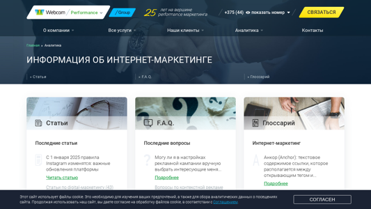 | SEO-описание | Информация о различных аспектах продвижения компаний в интернете: термины, полезные ссылки, аналитика от лидера поискового продвижения Webcom Performance |