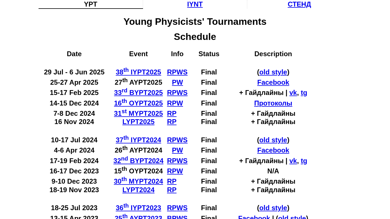 | AI-анализ | This website, titled "YPT Results," is a platform for providing information about various Young Physicists' Tournaments (YPT). The description section is empty, but based on the keywords and top_words data, it appears that this website focuses on listing the schedules, event info, and results of these tournaments, including their names, dates, locations, and statuses. Some tournaments have additional information such as social media links for group vk and tg, and online tournament versions. The data shows that there have been tournaments taking place from 2014 to 2025, with events like the 38th International Young Physicists' Tournament (IYPT) and 27th All-Belarusian Young Physicists' Tournament (AYPT), among others. The domain name is lesnevsky.ilyam.org.  |