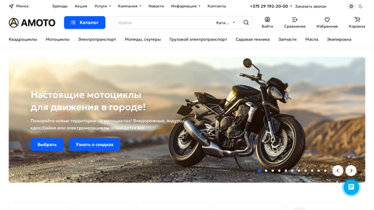 | SEO-описание | Добро пожаловать в АМОТО! Мы предлагаем широкий ассортимент мотоциклов, квадроциклов и электро-транспорта, а также запчасти и аксессуары для мототехники в Минске. |