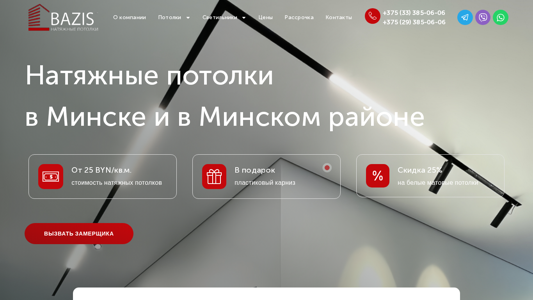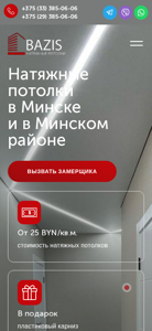 | AI-анализ | --- The website bazis.by is an online marketplace for suspended ceilings and lighting fixtures in Belarus. The homepage includes a title "Главная - bazis" and offers various types of suspended ceilings such as satin, glossy, textile, matte, and photo-printed ones, as well as exclusive and decorative options with hidden carpets, lighting, and decorative rails. The website also provides information on hanging ceiling types, including those with hidden carpets, lighting, and decorative rails, as well as suspended ceilings with photo-printed patterns, tinted ones with tracks, and textured options for various rooms, including studios, apartments, bathrooms, balconies, children's rooms, bedrooms, corridors, living rooms, dining rooms, kitchens, bathrooms, and attics. The website also |