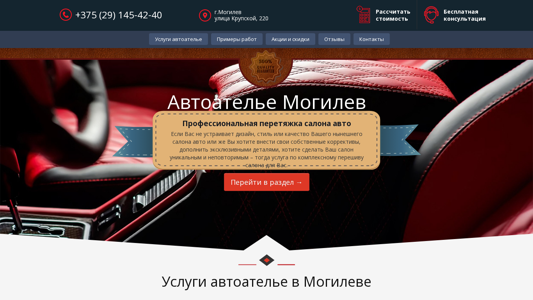 | AI-анализ | This website is for an auto atelier located in Mogilev, Belarus, offering a wide range of services for interior equipment of various car brands. The title of the website is "Автоателье Могилев. Выгодные цены на услуги автоателье!" The description mentions that prices for tuning services can be found on the site. The top words include 'auto', 'перетяжка', 'салона', 'ремонт', 'могилев', 'автоателье', and 'услуги'. The website contains sections for services, examples of work, discounts, and contacts. The main services offered include professional reupholstering of car interiors. The website also provides information on the gradual wear and tear of interiors over time, and the decision to repair or replace. Other services include repair of |