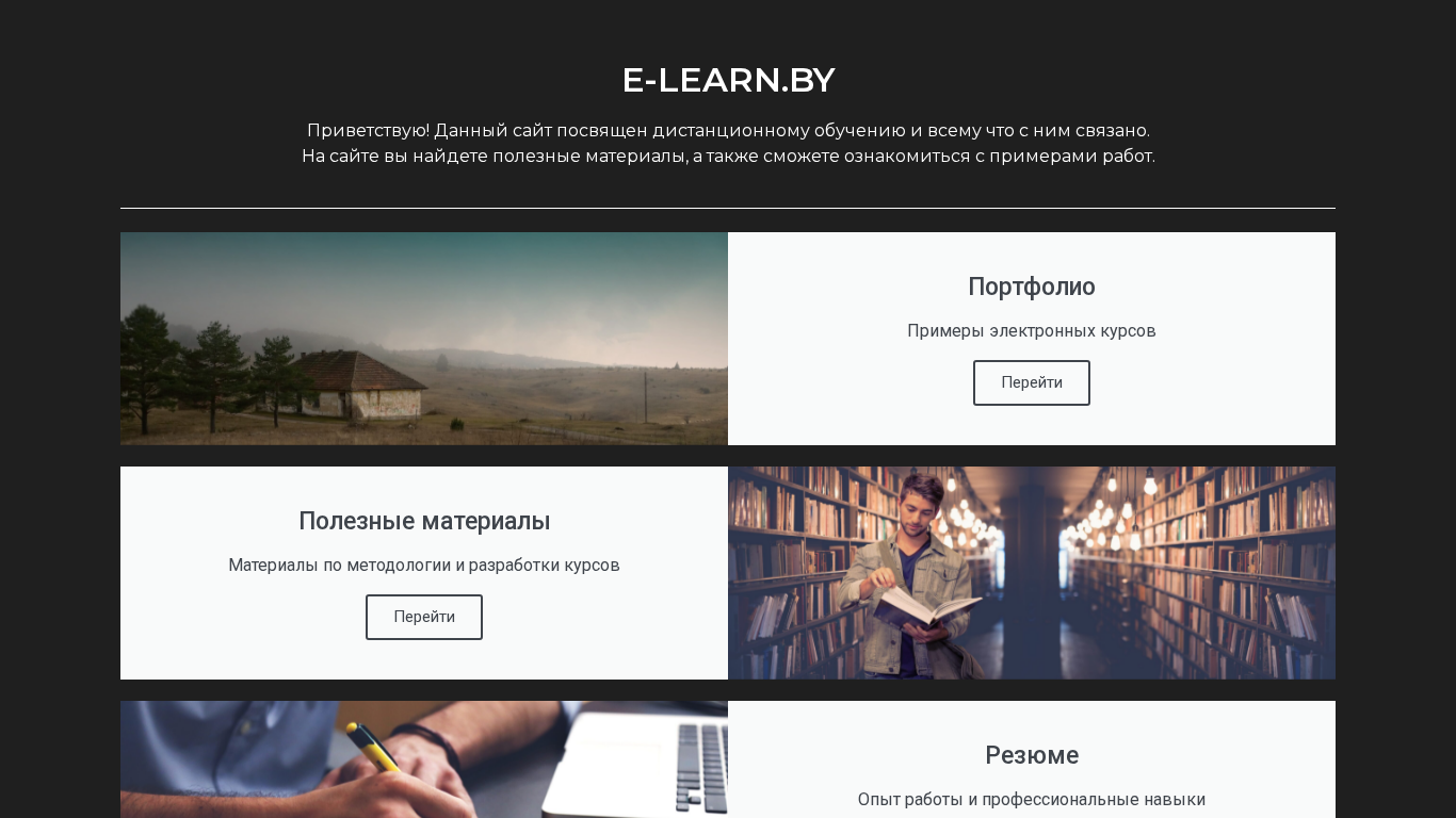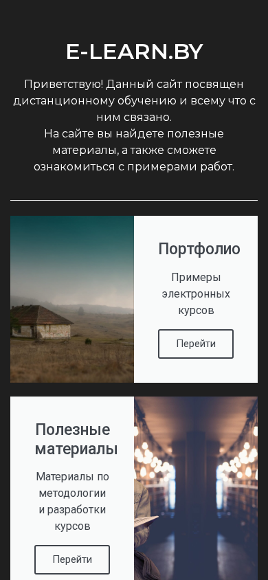 | AI-анализ | The web project E-Learn.by is dedicated to digital learning. Visitors can find useful materials and examples of works on the site. The portfolio section showcases electronic course samples, while the "Useful materials" section provides resources on methodology and course development. A resume of professional experience and skills is also accessible. Contact information includes an email address and phone number. |