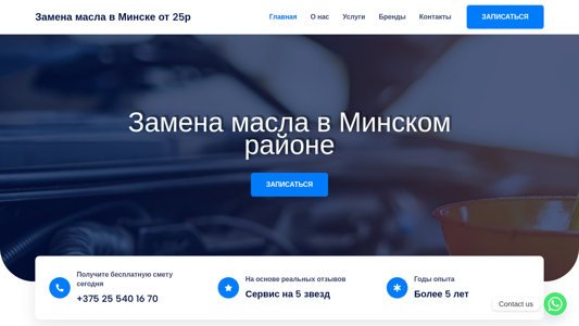 | AI-анализ | This online resource is dedicated to providing oil change services in Minsk, Belarus, starting from 25 Belarusian rubles. The website offers a range of services related to oil and filter replacement, including services for various types of engines, manual and automatic transmissions, and oil level checks. The company prides itself on using only proven oils and filters to ensure optimal vehicle performance. With over five years of experience, they aim to provide quick and reliable services, saving customers time. The website includes information about the company, its services, and contact details for booking an appointment. |