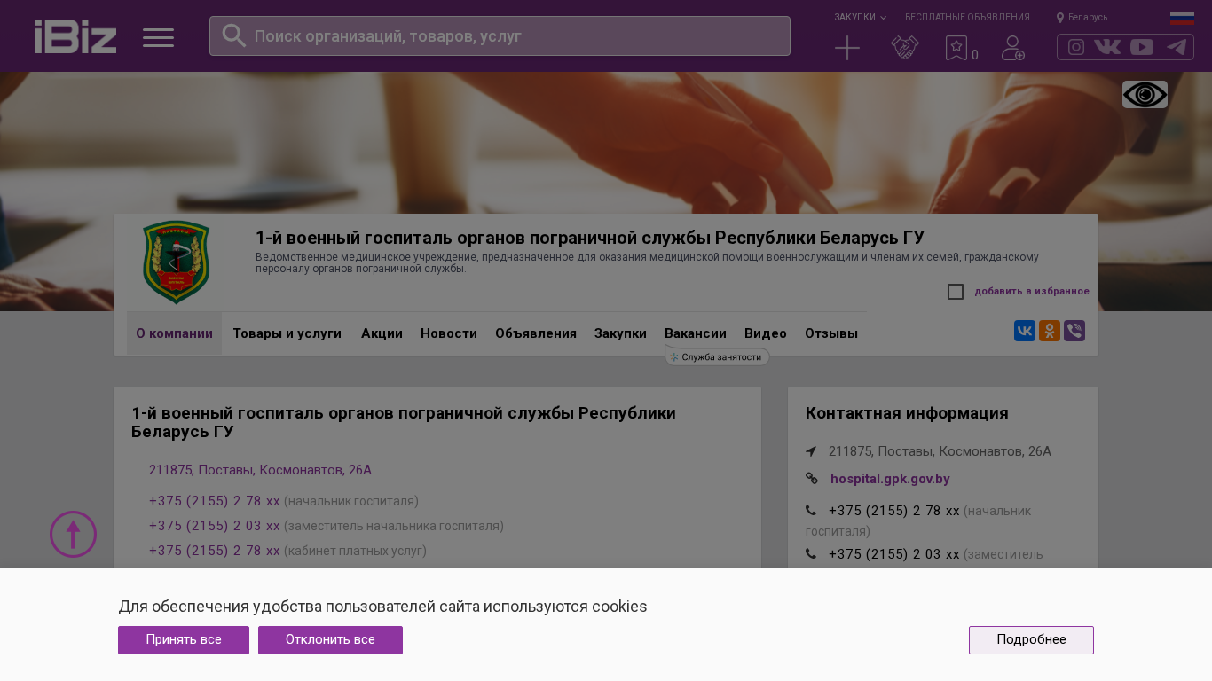 | Название / Заголовок | 1-й военный госпиталь органов пограничной службы Республики Беларусь ГУ - Ведомственное медицинское учреждение, предназначенное для оказания медицинской помощи военнослужащим и членам их семей, гражданскому персоналу органов пограничной службы.. 211875, Поставы, , Космонавтов, 26А |