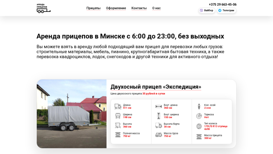 | AI-анализ | The portal avto-shop.by offers truck rentals in Minsk. You can rent any suitable trailer for transporting various goods every day from 6:00 to 23:00. The available trailers can be used for transporting building materials, furniture, pianos, large household appliances, as well as quad bikes, boats, snowmobiles, and other equipment for active leisure. There are two types of trailers available: a two-axle "Expedition" trailer with a daily rent of 35 rubles, a length of 511 cm, a width of 198 cm, a height of 360 cm, a total weight of 750 kg, an internal length of 360 cm, an internal width of 150 cm, a bottom board height of 30 cm, a cargo weight capacity of |