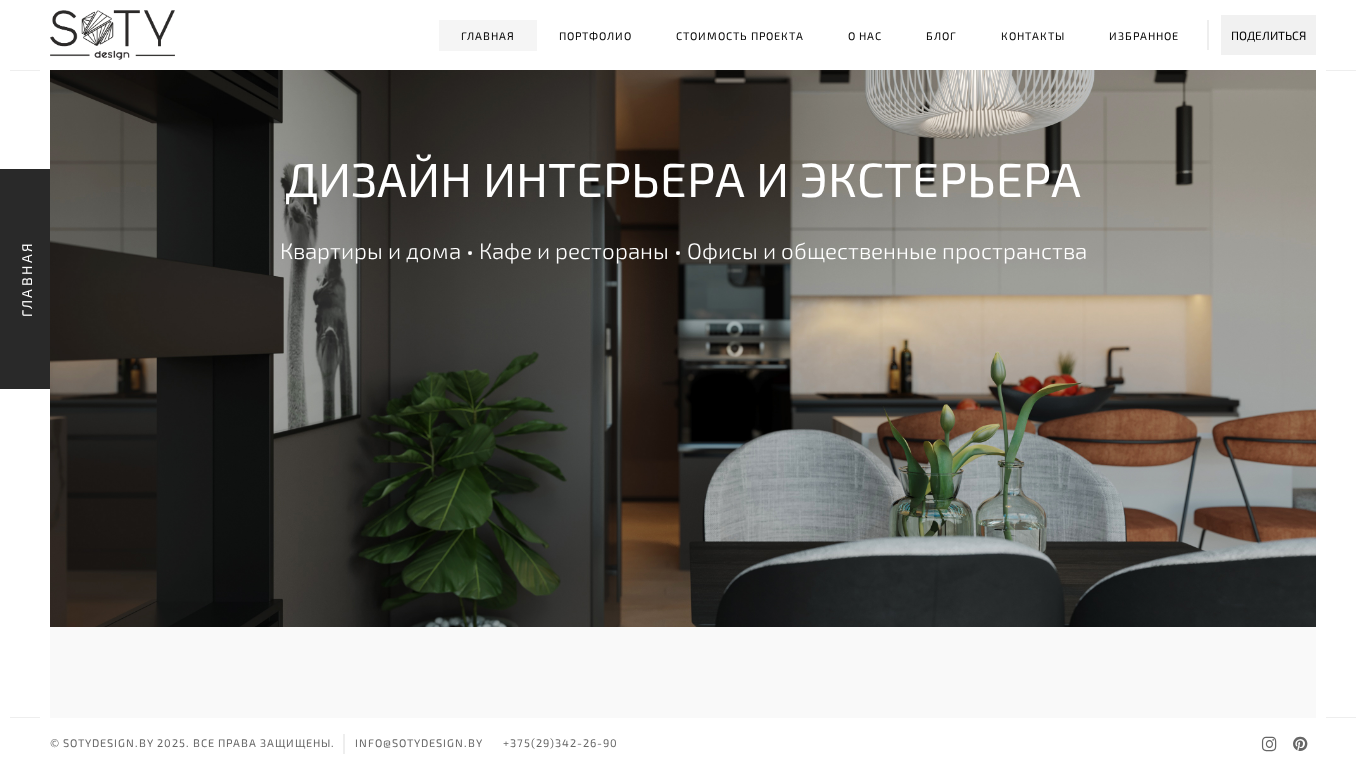 | AI-анализ | The website sotydesign.by is a design studio offering services for interior and exterior design projects. The website's title is "Главная" (Main in English) and it features sections for showcasing portfolios of completed projects, including cafes and restaurants, offices and studios, and residential spaces. The studio provides services worldwide, helping create unique and inspiring spaces. The contact information for inquiries is provided, including an email address and phone number. The website also has a blog and a section for favorites. Keywords associated with the website include "interior design," "exterior design," "studio," and "project." The top words on the website are "главная" (main), "квартиры" (apartments), "дома" (homes), "офисы" (offices), "кафе" (cafes), "ресто |