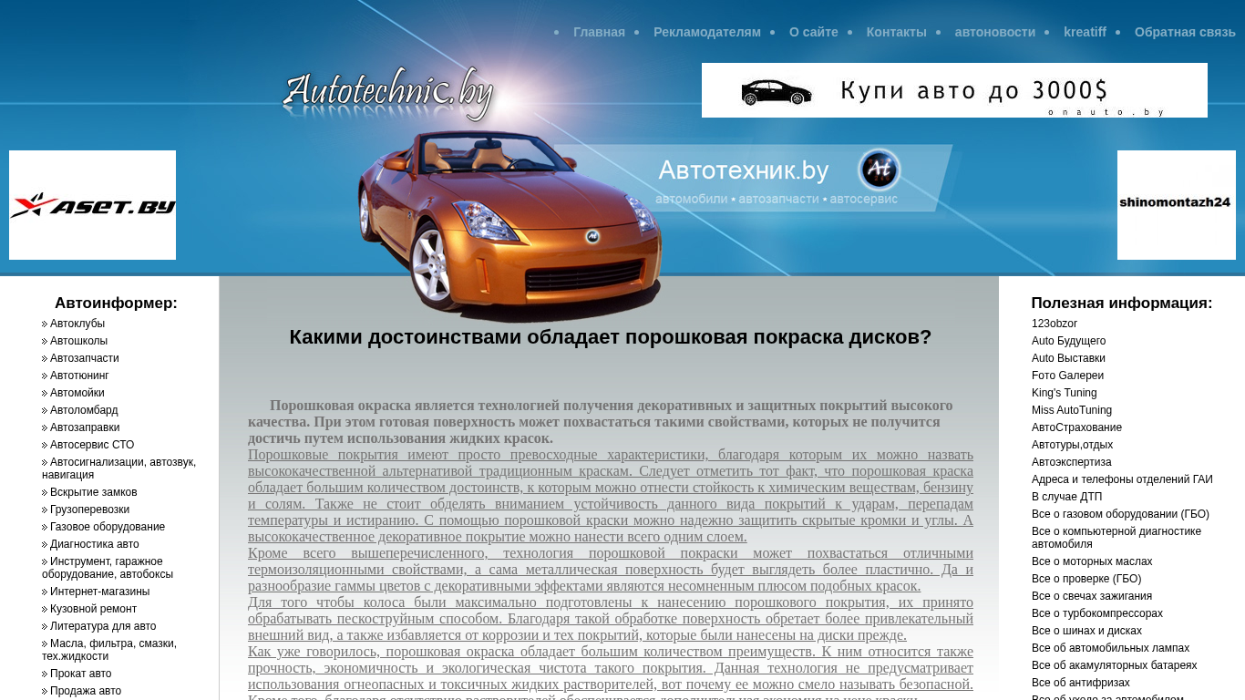 | Название / Заголовок | Автотехник.by | Какими достоинствами обладает порошковая покраска дисков? |