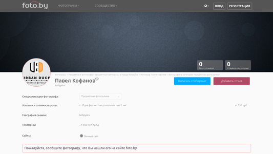 | AI-анализ | The portal is a photography website for Pavels Kofanov, a photographer based in Bobruisk, Belarus. The site primarily features photographs in the "Object Photography" category. Pavels identifies himself as a product photographer, and the site includes information on his pricing, services, and contact details. The site is part of the Foto.by network, which also includes a community of photographers and a catalog of various photography services. Users can leave reviews for photographers, view portfolios, and search for specific types of photography. The site is available in both Russian and Belarusian languages. |
