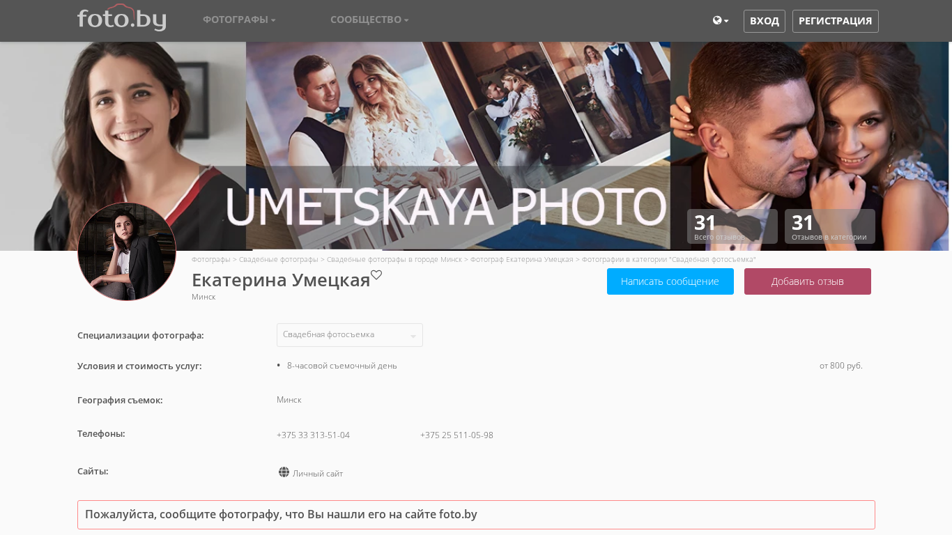 | SEO-описание | Фотографии в категории "Свадебная фотосъемка". Фотограф Екатерина Умецкая - выполняю следующие виды фотосъемок: свадебная фотосъемка, семейная фотосъемка, фотосъемка беременных. Работаю в городах: Минск, Брест, Гродно |