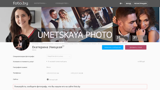 | AI-анализ | This website is a photography portfolio for Ekaterina Umeckaya, a photographer based in Minsk, Belarus. The website primarily features photographs categorized under "Свадебная фотосъемка" or wedding photography. Ekaterina Umeckaya offers various types of photo shoots including wedding, family, and maternity photography. She provides her services in the cities of Minsk, Brest, and Grodno. The website includes a community section for users to leave reviews and a blog for updates and announcements. The site also features statistics on the number of visitors and reviews in each category, as well as contact information for the photographer. |