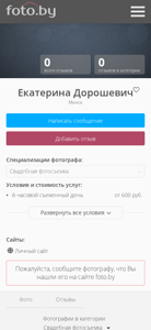 | AI-анализ | The website is that of photographer Ekaterina Doroshevich based in Minsk, Belarus. The site features photographs in the category of 'Wedding Photography'. Ekaterina offers her photography services for new year photo sessions in the city of Minsk. The website is part of the 'Photographers' main catalog on foto.by, and includes various categories such as 'Animals', 'Interiors', 'Corporate', 'Birth', 'Baptism', 'Newborns', 'Portraits', 'Food', and 'Love Stories'. Users can view all works, blog, and community activities of the photographer. The website also includes information on the photographer's specializations, pricing, and contact details. |