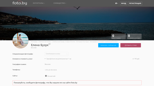 | AI-анализ | --- The web project "Фотограф Елена Бузук, Могилев" is a photography portfolio showcasing the works of a photographer named Елена Бузук, based in Могилев, Belarus. The portfolio focuses on family photography, with categories including child photography, family photography, and photography for pregnant women. The photographer's services are available in Могилев. |