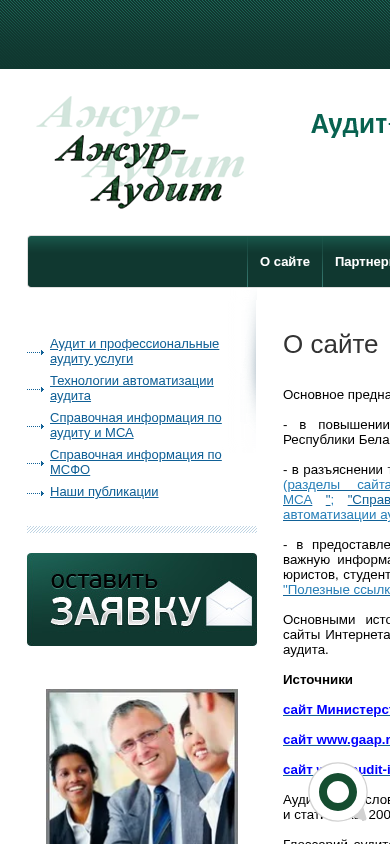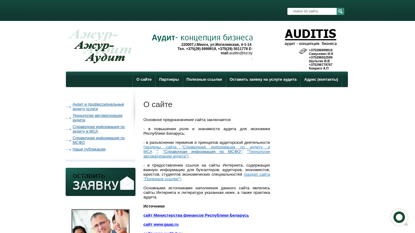 | AI-анализ | The portal auditis.by is a professional auditing site based in Minsk, Belarus. Its main purpose is to raise the importance and significance of auditing for the Belarusian economy, provide explanations and principles of auditing activities (sections "Spravochnaya Informatsiya po Auditu i MSA" and "Spravochnaya Informatsiya po MSFO"), and offer links to websites containing valuable information for accountants, auditors, economists, lawyers, and students of economic disciplines (section "Poleznye Sssylki"). The website's content is derived primarily from the internet and related literature, including sites like the Ministry of Finance of the Republic of Belarus (www.gaap.ru, www.audit-it.ru), and books such as "Audit: Uchebnoe Posobie/ I |