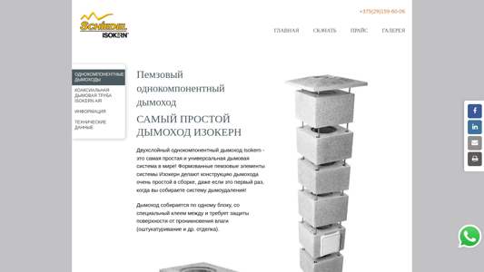 | AI-анализ | The web project "Schiedel ISOKERN - Безопасные дымоходы в Беларуси" is an informational site about Schiedel ISOKERN, a modular and safe fireplace chimney system for Belarus. The site provides information on the installation instructions, prices, and a gallery for the Isokern Air, a single-component chimney system made of pemzite elements for easy assembly. The site also offers options for sharing content on social media and email, as well as a print function. The site is available in Belarusian and Danish languages, with a contact number provided. The single-component chimney system is described as the simplest and most universal solution for chimney systems in the world, with the ability to assemble the chimney by one block with a special adhesive, and requiring protection from moisture exposure. The chimney is available |