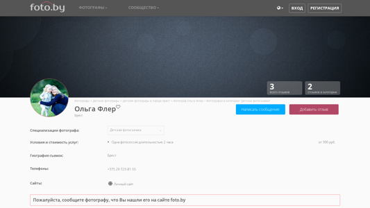 | AI-анализ | The web project "Фотограф Ольга Флер" is a photography website specializing in child photography. The site is operated by photographer Olga Fler in the city of Brest, Belarus. The main page of the website features a catalog of photographers, with Olga Fler's profile prominently displayed under the "Детские фотографы" (Children Photographers) section. The site offers services for photographing children, as well as pregnant women. The pricing for a two-hour photo session starts at 300 rubles. The site includes a contact telephone number and a personal website link. The website is part of the foto.by domain. |