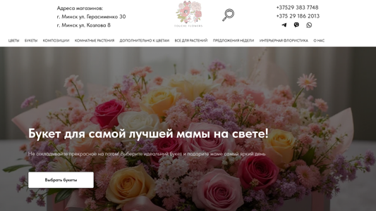 | SEO-описание | Предлагаем купить цветы в Минске с бесплатной быстрой доставкой. Широкий ассортимент свежих и отборных цветов. Выгодные цены. Заказать живые цветы: ???? +375 29 636 3110. |