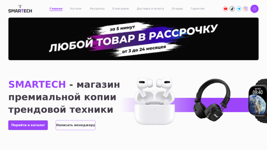 | AI-анализ | --- This website is titled 'Smartech' and is described as a 'Магазин трендовой техники' (Shop of trendy technology) in Russian. The keywords associated with the website include 'smart', 'watch', 'мес' (month), 'подарок' (gift), 'защитное' (protective), 'стекло' (glass), 'тканевый' (fabric), 'ремешок' (strap), 'блок' (block), 'питания' (power), 'добавить' (add), 'корзину' (cart), 'силиконовый' (silicone), 'чехол' (cover), 'aiprods', 'ultra', 'max', 'top', 'pro'. The website has the Belarusian .BY domain name 'smarttech. |
