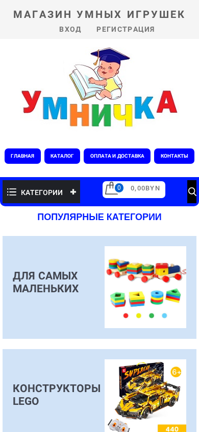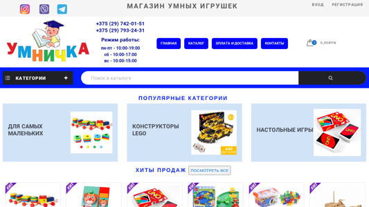 | AI-анализ | This online resource is a smart toys shop named "Умничка" (Umnichka). The website offers a wide range of products including wooden toys, game sets, puzzles, sorters, constructors, and various accessories for children. The shop sells Lego and other construction toys, dolls and accessories, magnetic toys, mosaics and puzzles, soft toys, table games, weapons, soldiers, souvenirs, and various decorative items. The homepage features a catalog, a shopping cart, and a registration and login area. The shop operates from Monday to Friday, 10:00-19:00, on Saturdays from 10:00-17:00, and on Sundays from 10:00-15:00. The contact information includes two phone numbers and the address. The website also has a section for popular |