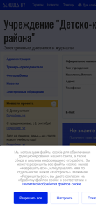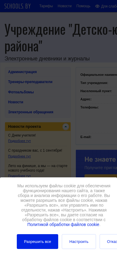 The website is for the "Children and Youth Sports School of Brahin District" in Belarus. It uses cookies for website functionality and data collection and analysis. Visitors can choose to accept all cookies or manage them individually. The site includes news and information about the sports school. The design is simple with a monochrome color scheme and images are turned off by default. The domain is dschbragin.schools.by.