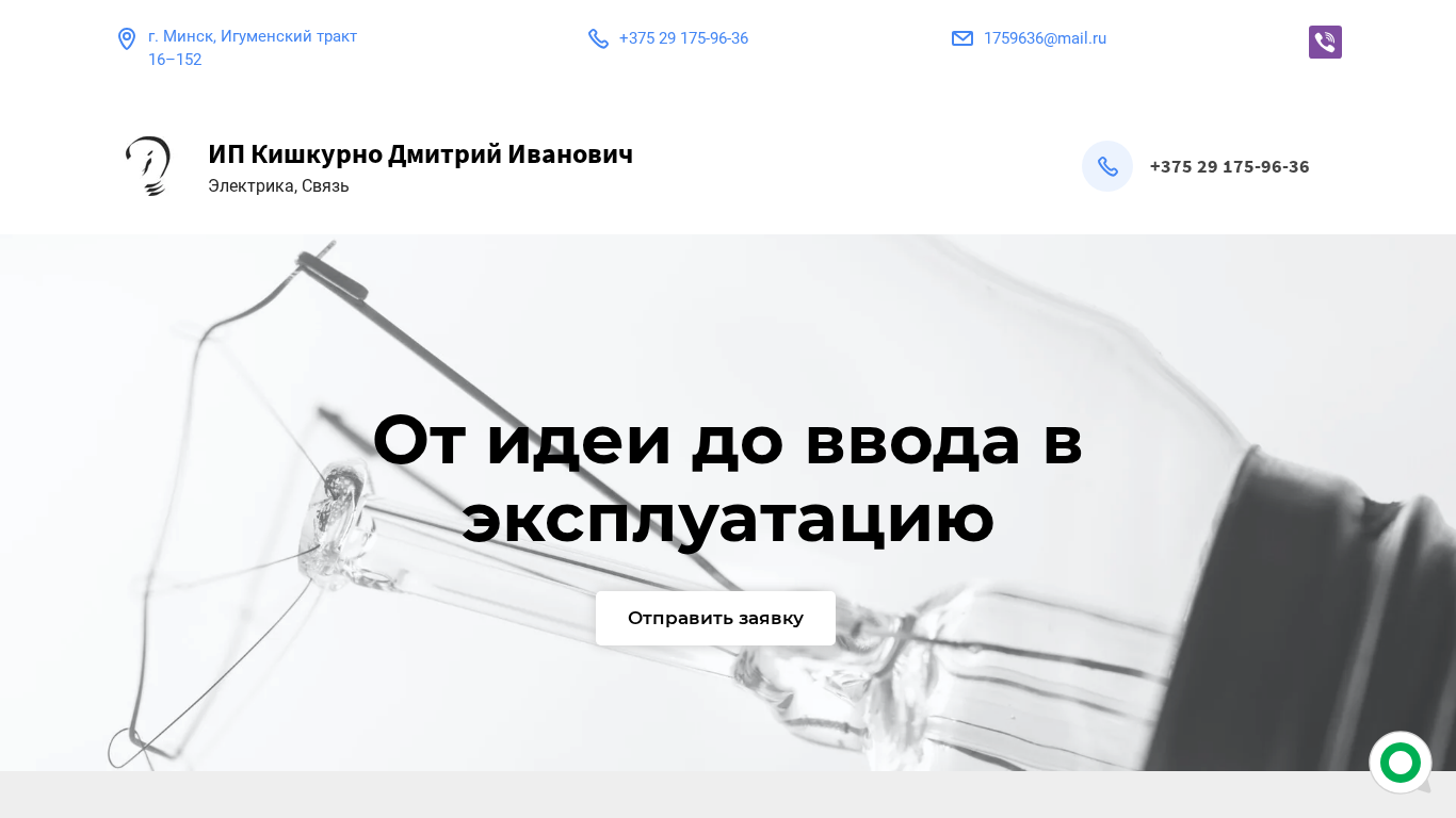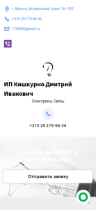 | AI-анализ | The web project "Electromontazh i montazh setei svyazi - IP Kishkurno Dmitriy Ivanovich | g.Minsk" offers a full range of services for interior and exterior electrical installation works and network cabling. The title includes the name of the business owner, location, and service categories. Keywords reflect the nature of the business, and top_words indicate frequent occurrences of specific terms on the site. The domain is 1759636.by, and the contact information includes a phone number, email address, and location in Minsk. |