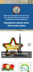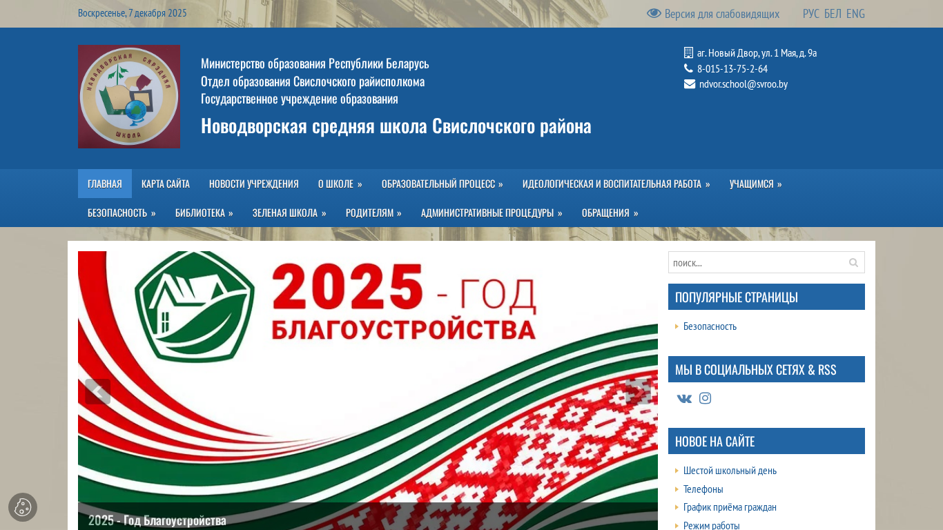 --- This website belongs to Новодворская средняя школа (New Dwore Middle School) located in Sviслоchsky district, Republic of Belarus. The school's address is Ul. 1 Мая, d. 9a, Novy Dwor village. The website provides information about the school, its history, traditions, achievements, educational process, vacancies, and various events. The school's mission, structure, and contact information are also available. The website is operated by the Ministry of Education of the Republic of Belarus and Sviслоchsky district executive committee. The content is available in Russian, Belarusian, and English languages. The website includes sections on news, tasks and functions of the school, school management, work schedule, and various projects. Additionally, it provides information on educational programs, sports, and cultural activities. The website also includes a section on safety