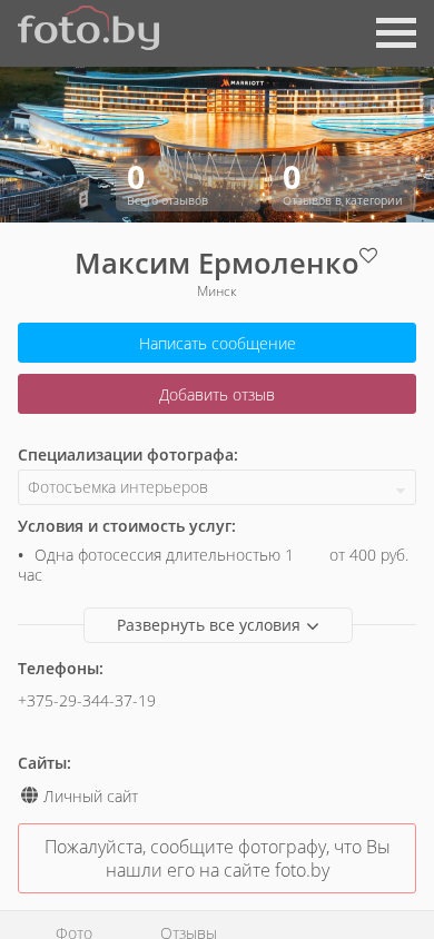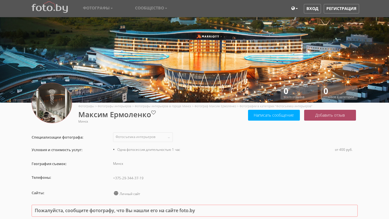 --- This online resource is a photography website belonging to Maxim Ermolenko, a photographer based in Minsk, Belarus. The website primarily features photographs in the category 'Фотосъемка интерьеров' (Interior Photography). Ermolenko specializes in subject photography, interior photography, and architectural photography. The site includes a catalog of photographers, community for photographers, and a blog. Visitors can browse through various categories such as 'Архитектуры', 'Интерьеров', and 'Предметов', among others. The website also includes information on pricing and contact details for the photographer. The domain for this website is mermolenko.foto.by.