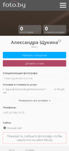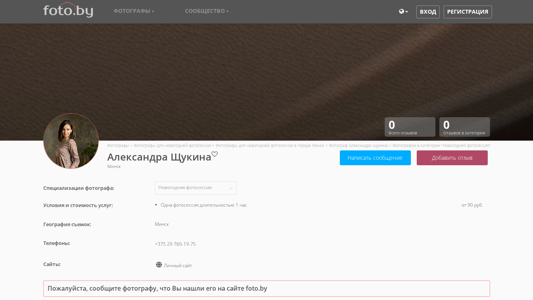 | AI-анализ | The website belongs to a photographer named Alexander Schukina, based in Minsk, Belarus. The homepage displays a catalog of photographers, with a focus on those offering services for New Year's photo sessions. Schukina's work is featured in this category, showcasing his photography styles. Visitors can find more of his photos through his contact details, which include id68799548 and Instagram handle @alexandra_schukina. The website also provides information on various photography categories, such as those for events, interiors, and portraits. The photography services offered include individual sessions, shoots for marketplaces, and coverage of concerts and other events. Prices for a one-hour photo session start at 90 rubles. The website is available in both Russian and Belarusian languages. |