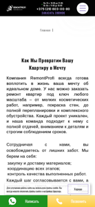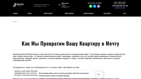 | AI-анализ | The website is titled "Ремонт квартир и домов в Минске – отделка помещений и услуги под ключ. Компания RemontProfi" and is about a company offering apartment and house repair services and interior design in Minsk, Belarus, with a focus on turnkey solutions. The company was established in 2005 and provides various repair services such as demolition, electrical, plumbing, stucco work, flooring installation, partition wall installation, tile laying, painting, wallpaper hanging, and laminate flooring repair. They also offer interior design services. The contact information includes an office address, phone number, and a call-back request form, along with business hours. The menu includes sections for the main services, deconstruction works, electrical works, plumbing works, stucco work, flooring |