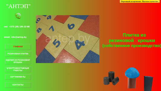 | AI-анализ | language: ru --- The website is a Russian-language e-commerce platform selling rubber tiles produced in-house by "АНТЭП". The homepage includes information about the availability and pricing of rubber tiles suitable for both outdoor and indoor use. The tiles come in various colors and are marketed as trauma-safe for children's playgrounds, schools, and sports facilities. The website also offers the sale of other building materials, equipment, and tools at low prices, with a contact number provided for inquiries. The top words in the metadata suggest keywords related to the sale of rubber tiles, the company name "АНТЭП", and contact information. The website also mentions the availability of electromontage works and the benefits of working with the company, such as delivery by the company's transport, original products, a large and competent team, and flexible working conditions. The contact information includes a |