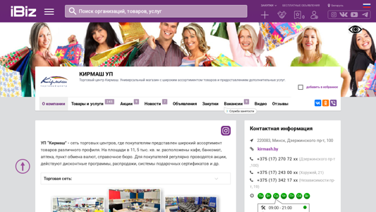 | Название / Заголовок | КИРМАШ УП - Торговый центр Кирмаш. Универсальный магазин с широким ассортиментом товаров и предоставлением дополнительных услуг.. 220083, Минск, , Дзержинского пр-т, 100 |