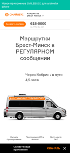 | Название / Заголовок | Заказать маршрутное такси ✪ Минск ➤ Брест ➤ Минск по М1✪. АКЦИЯ! Проезд от 35 BYN. Звоните ☎ мтс, вел, лайф 618-0000 ✔ бесплатный WI-Fi, ✔ фильмы в дороге, ✔ онлайн-заказ мест. | Смайлбус |