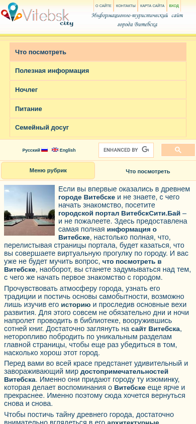 SEO-описаниеЕсли вы впервые оказались в древнем городе Витебске и не знаете, с чего начать знакомство, посетите городской портал ВитебскСити.Бай – и не пожалеете. Здесь предоставлена самая полная информация о Витебске, настолько полная, что, перелистывая страницы портала, будет казаться, что вы совершаете виртуальную прогулку по городу. И вас уже не будет мучить вопрос, что посмотреть в Витебске, наоборот, вы станете задумываться над тем, с чего же начать первое знакомство с городом.