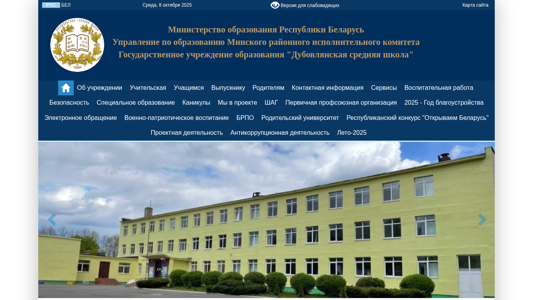 | AI-анализ | The web project "Дубовлянская средняя школа" (Dubovlyany Middle School) is an educational institution website in Belarus, managed by the Ministry of Education of the Republic of Belarus and the Minsk Regional Executive Committee. The site provides information on the school's history, leadership, academic programs, and various initiatives. Keywords associated with the site include "school," "middle," "education," "pupils," "read," "further," "class," "safety," "news," "Seницkaya," "children," "years," "participation," "institutions," "step," "language," and "Belarus." The site offers sections for subjects, class schedules, and a school newspaper, as well as information on enrollment, vacancies, and international educational collaborations. The design is standard, with |