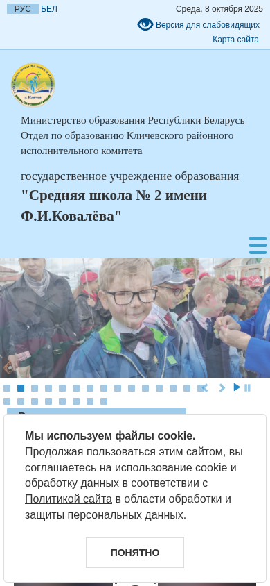 | AI-анализ | --- This online resource is the official website of the Middle School No. 2 named after F.I.Kovalev in Klichev, Belarus, under the Ministry of Education of the Republic of Belarus. The title of the website is "СШ 2" and the description mentions various topics such as news, organization, education, and contacts. The most frequent keywords are "2025," "читать" (read), "далее" (further), "образования" (education), "новости" (news), and "учреждение" (organization). The website uses cookies and has options to change font size and color scheme. The main sections of the site include information about the management of the school, application forms, administrative procedures, contacts, and a calendar of events. The website also provides information on the school's educational standards, food services |