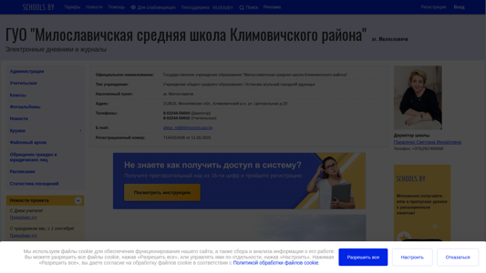 | AI-анализ | The website of Miloslaвичская средняя школа (Miloslaвичskaya Srednyaya Shkola) in Klimovichsky District, Belarus, is an educational institution that uses cookies for its operation and data collection. The website's title is "ГУО 'Милославичская средняя школа Климовичского района'" and it is ranked by top words such as "school", "education", "work", "time", "plan", and "site". The domain name is miloslavichi.schools.by. The website uses cookies for functionality and web analytics. Users can accept or manage cookie settings through a pop-up banner. The site's color scheme is white and the images are turned off in black and white. The website provides information about the school, including its name, location in Belarus, and the use of cookies |