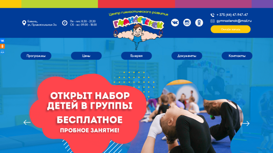 | SEO-описание | Гимнастический центр "Гимнастёнок" предоставляет различные программы оздоровительной, развивающей, спортивной и художественной гимнастики, занятия на батутах и стретчинг в Гомеле для детей и взрослых. Записаться на курсы гимнастики вы можете по телефону: 8 (044) 47-947-47 |