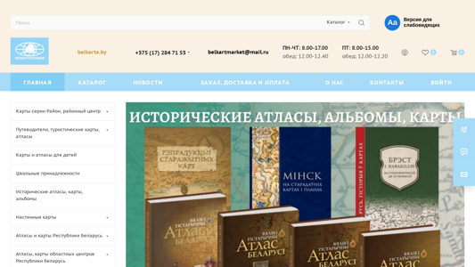 | SEO-описание | Интернет-магазин РУП «Белкартография». Заказывайте картографическую продукцию на сайте или звоните по телефонам +375 (17) 284 71 53, +375 (17) 334 81 54 |