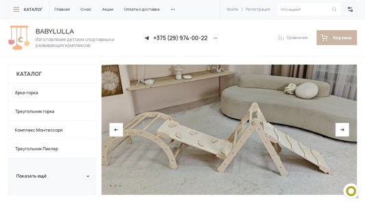 | AI-анализ | The website Babylulla is a production platform based in Minsk, Belarus, specializing in the manufacture of children's sports and developmental complexes. Run by a team of caring and loving parents, their mission is to ensure free and natural psychological, social, and physical development of children. The website offers a catalog of various products, including arkas (arkas are multi-functional play structures), triangular frames, Montessori complexes, transformer piclers, and transformer picler arks, as well as home and cottage furniture, mattresses, and Ark Lulla. The catalog includes categories for each product, and users can filter their search by price range, producer, availability of new items, and special offers. The website offers a quick view option, and users can add items to their cart, wish list, or compare products before making a purchase. Products listed include a foam cyl |