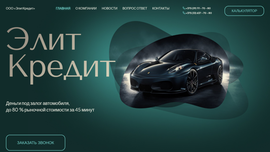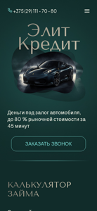 | SEO-описание | Автозаем денег под залог автомобиля в Минске. Получить средства в автоломбарде ЭлитКредит. Ценим ваше время, работаем быстро. Деньги под залог автомобиля до 80 % рыночной стоимости за 45 минут |