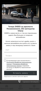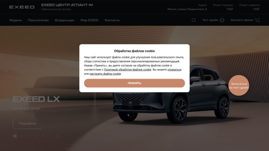 | AI-анализ | The web project atlantm-exeed.by is an official dealer website for Exeed cars in Minsk, Belarus. It offers the model range of the brand with prices and credit options available. Visitors can select and purchase Exeed cars at Atlant-M Dombrovskaya. The dealership is located at ul. Lechitskogo, 4, with sales and service departments. The site also provides test-drive requests, special offers, and financial programs for corporate clients. The brand's technology, comfort, and safety features are highlighted, along with news and events. Contact information, test-drive requests, and a blog are also accessible. The website includes models like the Exeed LX, RX, VX, and TXL, with various colors and specifications. Prices start from 74,300 BYN for the LX model, 1 |