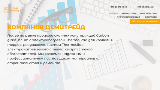 | AI-анализ | --- The website is a company selling building materials and offering related services. The main product categories are Carbon glass, Thermo Pad for roofs and terraces, Thermoslide, and thermally insulated glass panels. The company claims to be a reliable and professional supplier in the market of window construction and repair. Carbon glass windows are described as high-tech products made with innovative technology, featuring a durable structure, high thermal and sound insulation, and resistance to external weather conditions. Thermo Pad for roofs and terraces is an innovative product that provides quick and even heating of surfaces, and can be used for roof and terrace heating. Thermoslide is a practical and aesthetic way to divide space in a room, functioning as partitions or doors and allowing free access to adjacent rooms. Thermoslide systems have a robust construction and are easy to install. The website also offers heating solutions, specifically in |