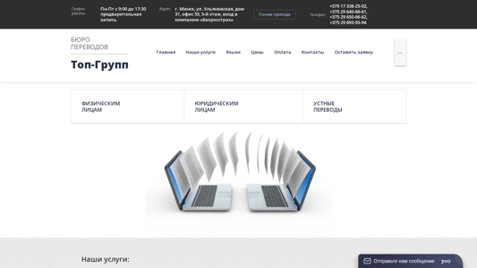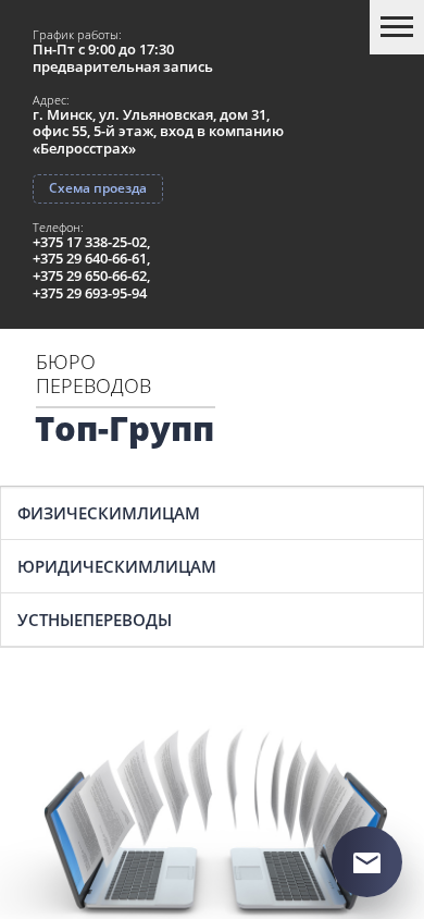 | SEO-описание | «Топ-Групп» — бюро переводов в Минске. Профессиональный штат переводчиков выполнит устный или письменный перевод точно в срок — принимаем заказы любой сложности! Получите готовый перевод в нашем офисе, курьером или по email. |