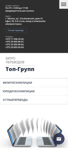 | AI-анализ | This website is for a translation bureau named "Топ-Групп" located in Minsk, Belarus. The bureau specializes in both oral and written translations and boasts a professional team of translators capable of delivering translations on time. Customers can pick up the completed translations at the office, receive them via courier or email. Keywords include translation bureau, oral translation, written translation, documents, and services. The website offers various translation services such as apostille, consular legalization, double consular legalization, and notarial services. The hours of operation are Monday to Friday from 9:00 AM to 5:30 PM, and appointments can be made in advance. The address is given as Minsk, Ul. Ulyanovskaya, house 31, office 55, 5th floor, entrance to "Belrosstr |