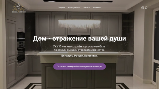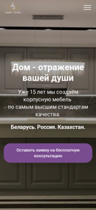| AI-анализ | --- This website is a furniture custom order platform based in Belarus, Russia, and Kazakhstan. The homepage includes a gallery, information on the ordering process, customer reviews, and contact information. The title is "Главная страница" (Main Page) and the description is "Мебель на заказ Беларусь, Россия, Казахстан" (Custom Furniture Ordering Belarus, Russia, Kazakhstan). The keywords include "мебель минск" (Minsk Furniture), "мебель на заказ минск" (Custom Order Furniture Minsk), "премиум мебель" (Premium Furniture), and "мебель на заказ россия" (Custom Order Furniture Russia). The top words are "все" (all), "ваш" ( |