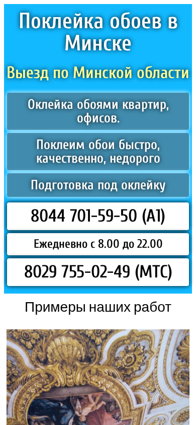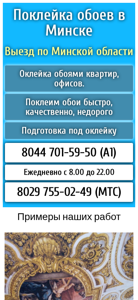 | AI-анализ | The website is an affordable wallpaper hanging service based in Minsk, Belarus. The company offers wallpaper installation without seams and removal of old wallpaper for reasonable prices. They provide decorative and photo wallpaper services, and guarantee customer satisfaction with a money-back policy. The website features contacts for two phone numbers, one for Belarusian and one for MTS mobile network, and operates daily from 8:00 am to 10:00 pm without holidays or weekends. The site also includes examples of their work and information on prices for various services such as wallpaper removal, preparation, and installation. The site is a one-page, low-cost website. |