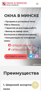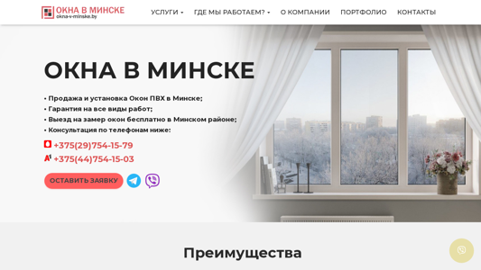| AI-анализ | --- The portal okna-v-minske.by offers windows for sale and installation in Minsk, Belarus. The company specializes in PVC, wooden, aluminum, and combined window types, catering to various thermal and sound insulation needs and design preferences. Customers can benefit from a free measurement and consultation service, modern production using advanced equipment and quality materials, and professional installation ensuring airtightness and longevity. The website provides detailed information on window types, their dimensions, and prices. The company operates in various districts of Minsk, including Borovlyany, Sloboda, Dzerzhinsky, Fanipol, Logoysk, Mariina Gorka, Osiopovichi, Zhodino, and Berezino. Contact information includes phone numbers +375(29)754-15-79 and +3 |