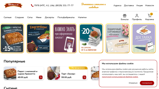 | AI-анализ | --- This online resource is a website for the cafe chain 'Штолле' in Minsk, Belarus, offering homemade pies for order and delivery in the city. The website provides an ordering system for customers to place their orders both online and by phone using the numbers 7989 and 8 (029) 331-77-77. The website features a wide range of pies, including those with various fillings such as meat, vegetables, fruits, and cheeses. Some popular items include the 'Пирог с малиной и сыром' (Raspberry and Cheese Pie), 'Торт «Захер»' (Cake 'Zacher'), and 'Пирог с тунцом' (Tuna Pie). The website also offers a selection of side dishes, sauces, and bever |